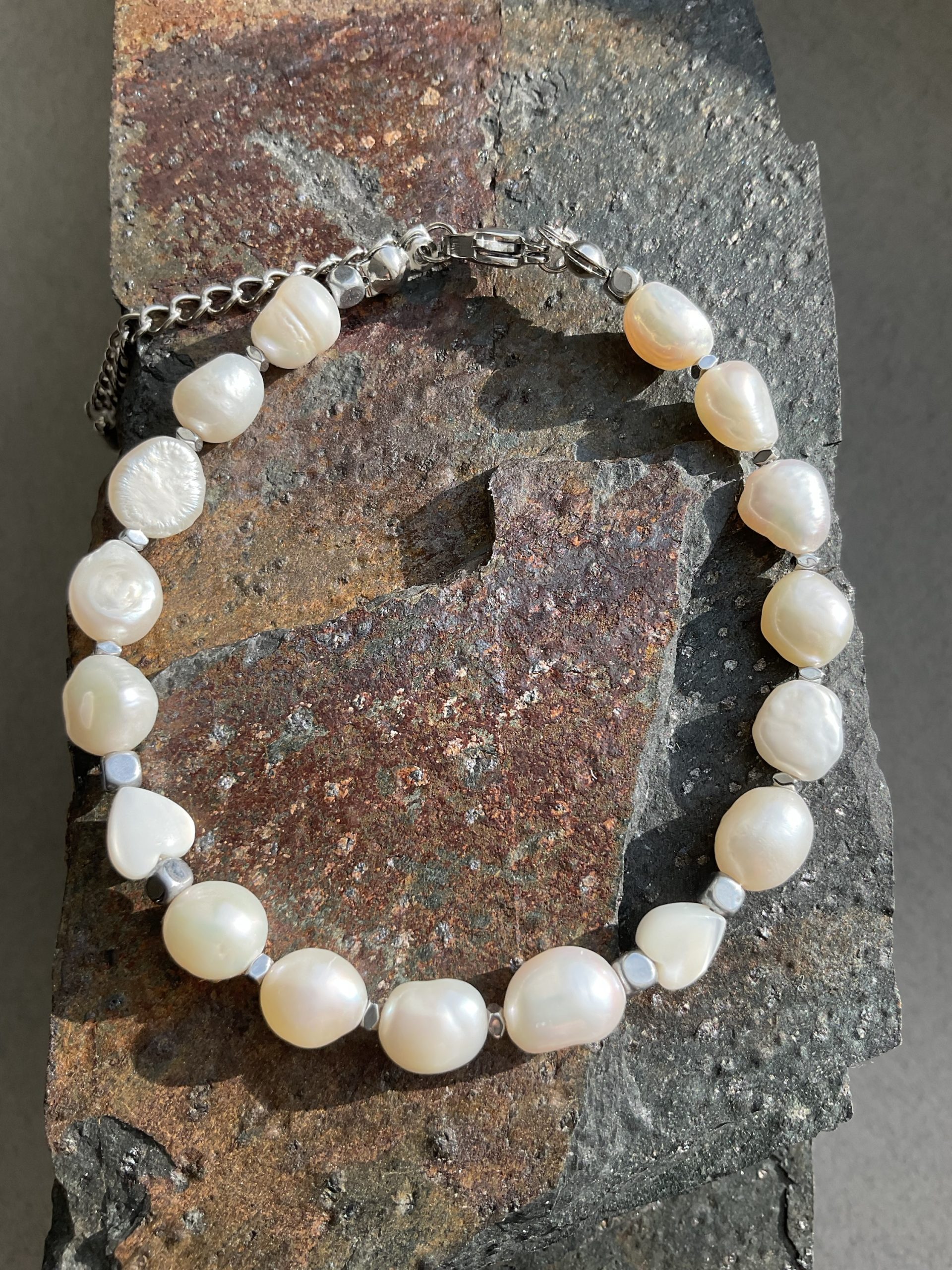 Браслет Перли, форма овал з вставкою намистин гематиту. Розмір намистини 4-10мм, розмір15см+4см обхвату. Ціна за шт.