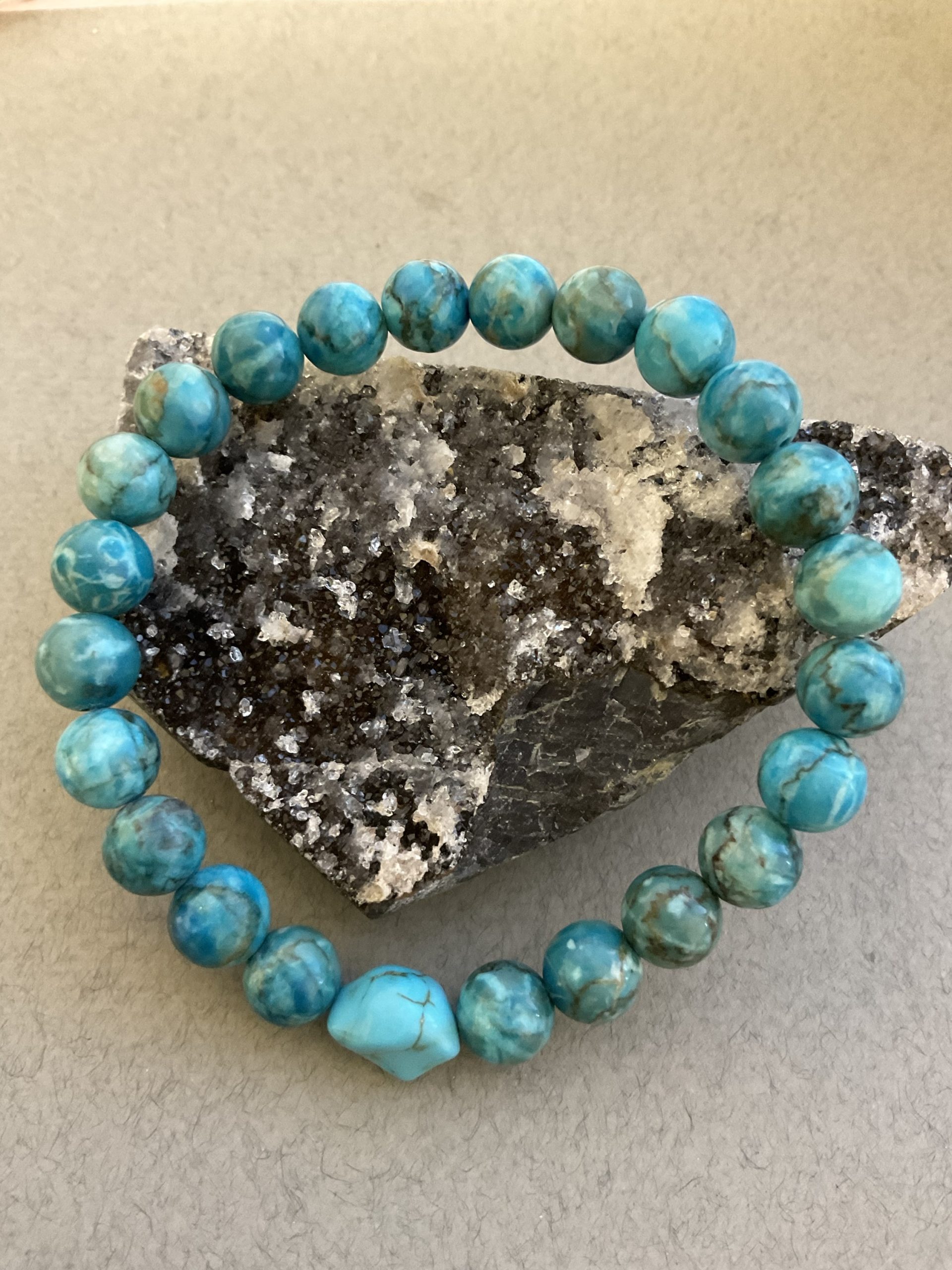 Браслет Південно- африканська бірюза, форма куля гладка з вставкою намистини. Розмір намистини 9мм, розмір 17см обхвату. Ціна за шт.
